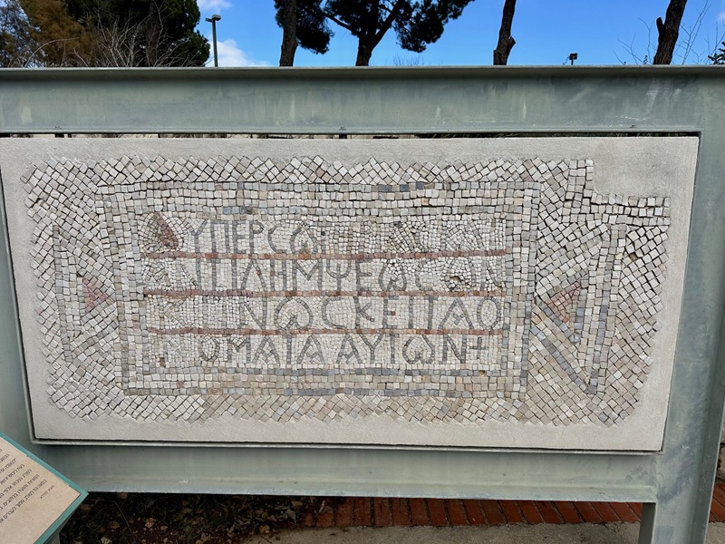 The Mamilla Mosaic: Discovered in the 1990s during salvage excavations for the development of Mamilla pedestrian mall, the mosaic was originally set in a niche in front of a burial cave filled with dozens of skeletons. This burial cave was associated with the Persian invasion of Jerusalem and the slaughter of its Christian population in 614 AD. The inscription reads in Greek:
