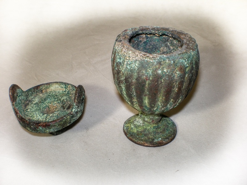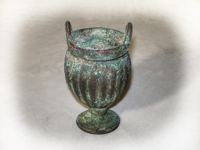 Bronze Inkwell of chalice shape with vertical ribs and a top soldered on with lead. Dated to the 1st Century BCE – 1 Century CE.