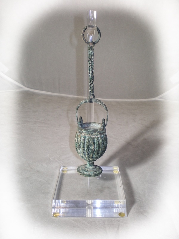 Bronze Inkwell of chalice shape with vertical ribs, loop handle suspended from a woven bronze chain. Dated to the 1st Century BCE – 1 Century CE.