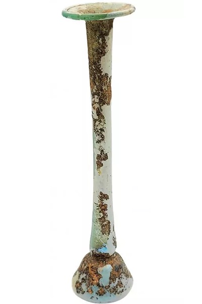 The oldest evidence of glassblowing was found in Jerusalem in 1970s, under today’s Jewish Quarter. The vessels produced were typically 3-6 inches tall, featuring a characteristic long neck and a bulbous body. Their colors ranged from pale blue to clear green.