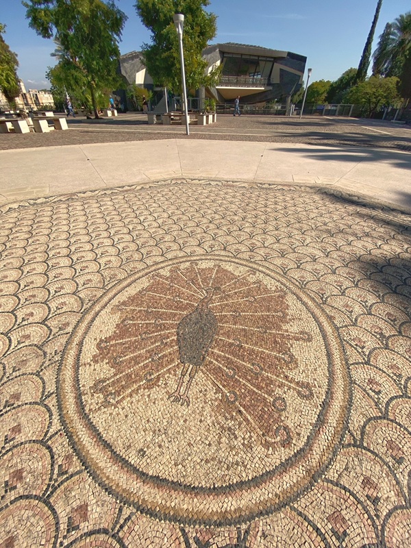 A replica of Capernaum’s Otcagonal Church mosaic floor on display in Capernaum.And how does a peacock relate to healing? The peacock sheds its feathers annually – but they grow back again. Its restored and renewed wings symbolize the healing of a body after it has been blemished. This is also why it is the only time in Christian art that the peacock appears with it wings spread.