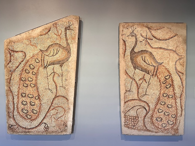 A pair of peacocks on display at the Getty Villa Museum, originally from a Church in the Levant from the Byzantine Period.