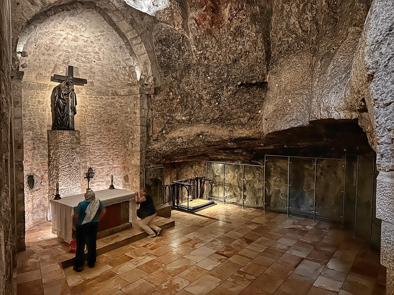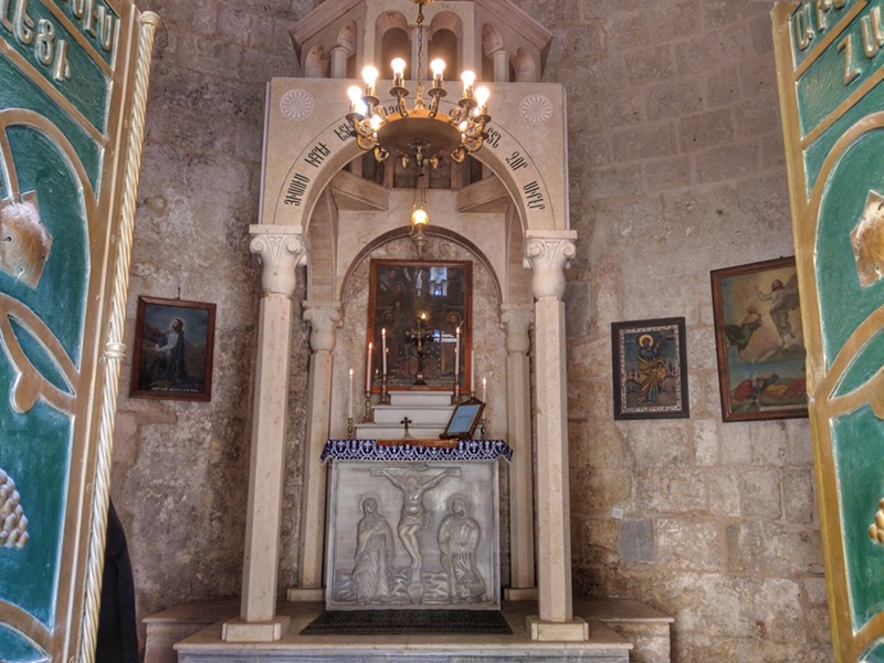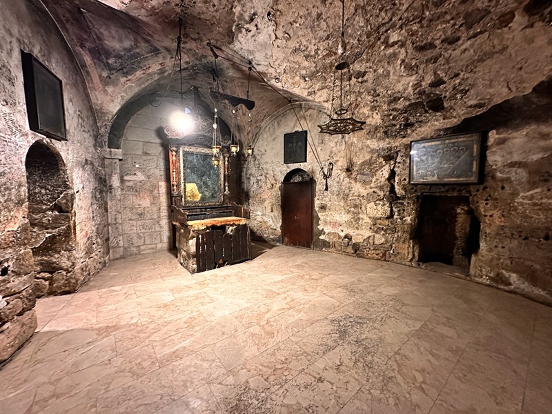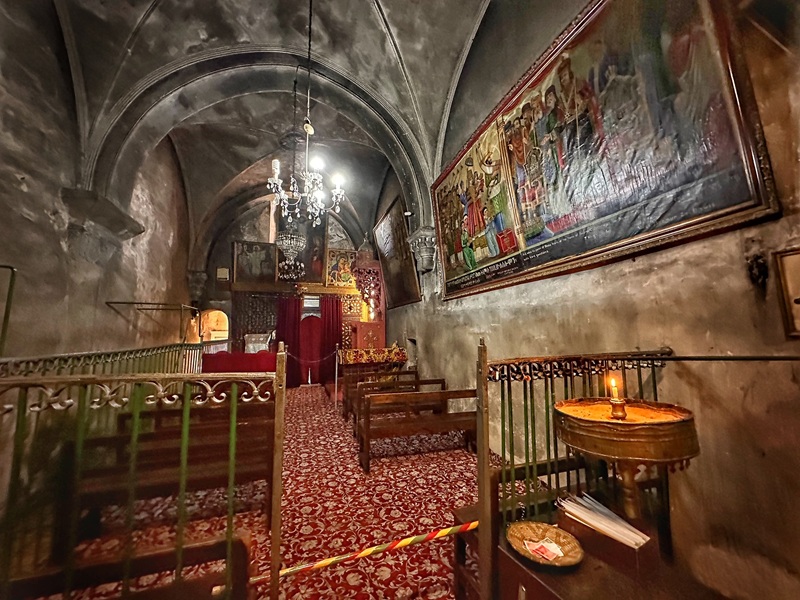Moreover, right of the entrance is a slab of stone with two holes above a small cavity. By local tradition, Jesus was chained here with his legs. A wall mosaic in the back depicts the event.