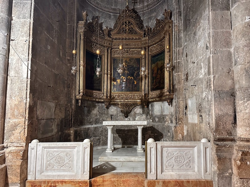A candlestand beside the commemorative ciborium invites pilgrims to light votive candles. Its back wall also features a large mosaic depicting the crucifixion scene. An adjacent stairway leads to a section of the church’s second floor used as an Armenian monastery.