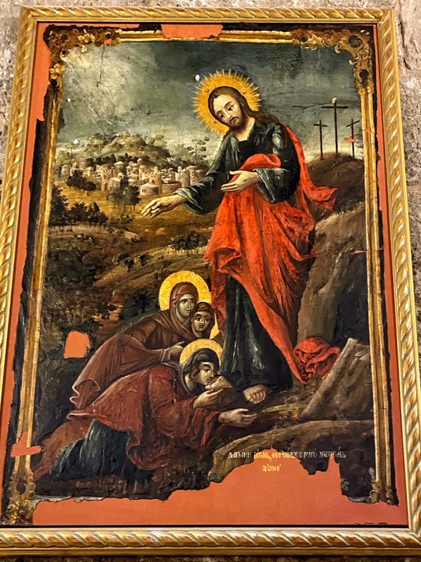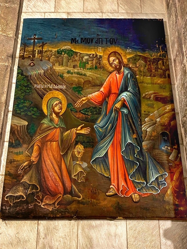 This icon is devoted to Mary’s encounter with Jesus after his resurrection. According to the Gospel of John after finding the empty tomb and alerting Peter, Mary stood weeping outside the tomb. Jesus then appeared to her, but at first, she mistook him for a gardener. When he revealed his true identity, Mary cried out “Rabboni” (in Aramaic – “my master”). Jesus replied – “Touch Me not, for I am not yet ascended to My Father” (John 20:17). The Icon is painted in a hybrid Byzantine, Medieval, and Renaissance style. Jesus stands in front of Mary kneeling. In the back are the empty tomb, bearing the Greek text – O ΠΑΝΑΓΙΟΣ / ΤΑΦΟΣ ( “The holiest tomb”), the Golgotha, and Jerusalem’s walls. Above Jesus’ head, the Greek initials ΙΣ ΧΣ clarify his identity (“Jesus Christ”. Above Mary, her full name appears as – ΜΑΡΙΑ Η ΜΑΓΔΑΛΗΝΗ (“Mary the Magdalene”). The biblical quote Μη ΜΟΥ Απ ΤΟΥ (“Touch me not”) crowns the compizition. The Greek letters “ΑΩΛΗ” added next to the empty tomb indicate the icon was made in 1838.