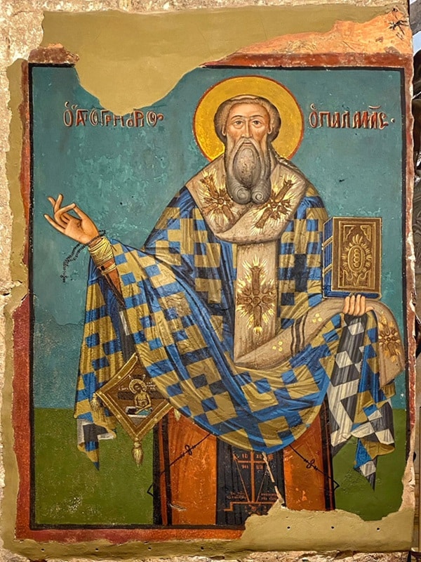 The icon follows the traditional Byzantine style, though its lower portion has deteriorated beyond restoration. The Greek inscription behind his head reads Ο ΑΓΙΟ ΔΙΟΝΥCς / Ο ΑΡΕΟΠΑΓΙΤΗΣ (“Saint Dionysus / the Areopagite”). His attire includes an “Epigonatio,” an honorary vestment depicting Jesus as a winged angel. Above this image are the Greek initials ΙΣ ΧΣ (“Jesus Christ”), accompanied by the inscription Ο ΤΗΣ ΜΕΓΑΛΗΣ ΒΟΥΛΗΣ ΑΝΓΓΕΛΟΣ (“The Angel of the Great Counsel”) – a reference to Isaiah 9:5 that Christians interpret as referring to Jesus.