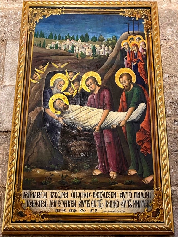 Below this scripture, the artist’s signature appears in Greek: χειρ δημητριου απου χαιδουρ (“The Hand of Demetrios abu Haidur”). The Arabic name of his father suggests the Greek artist’s Turkish origins. Near the tomb, the date “1859” marks the year of the icon’s creation.