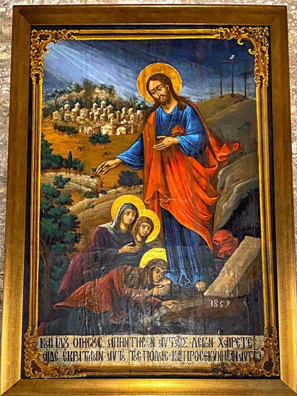The second Icon devoted to the Resurrection of Jesus depicts Jesus standing outside the tomb, bestowing a blessing upon three kneeling women. In the background is a forested and mountainous landscape, the skyline of Jerusalem, and the hill of the crucifixion, the Golgotha.