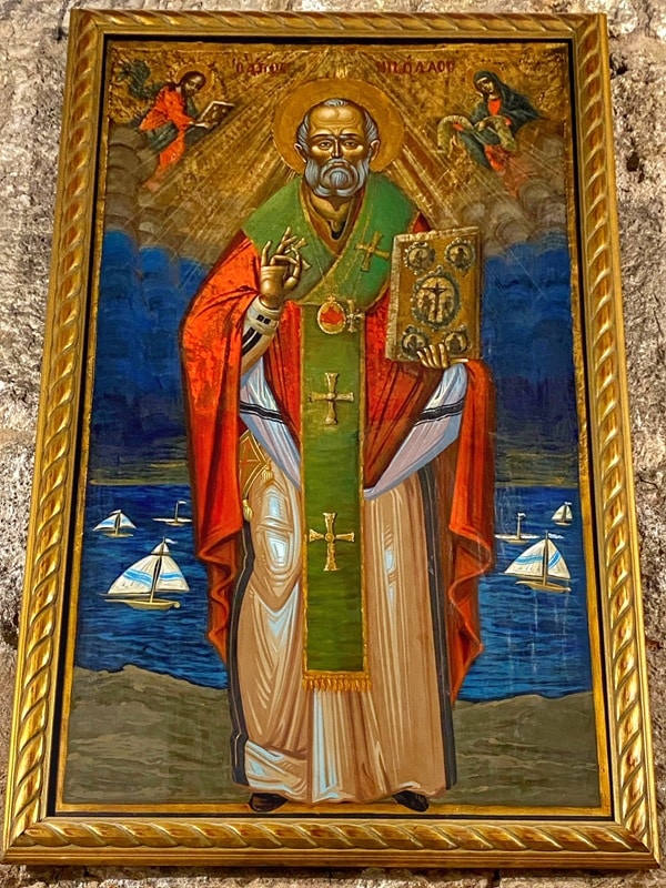 The restored icon in the Holy Sepulchre follows Byzantine artistic conventions. Nicholas appears in priestly vestments, holding a bible in one hand while representing the letters ΙΣ ΧΣ (“Jesus Christ”) with the other. The Greek inscription ΙΟ ΑΓΙΟΣ ΝΙΚΟΛΑΟΣ (“Saint Nicholas”) appears behind his head, flanked by small images of Jesus and Mary holding Jesus’ burial shroud. The background features several sailboats on a vast sea, referencing his role as patron saint of sailors.