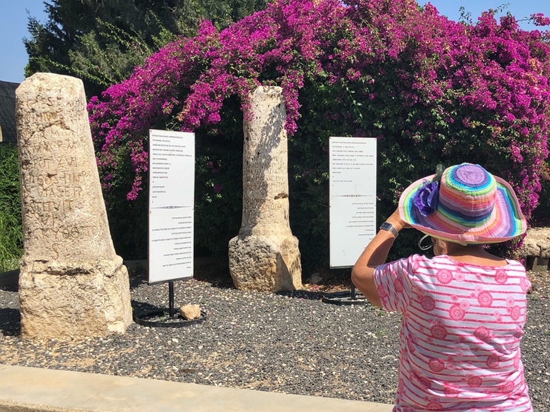 A tourist taking a photo of the display of the milestones in Kibbutz Tirat-Zvi. (C) Danny Herman