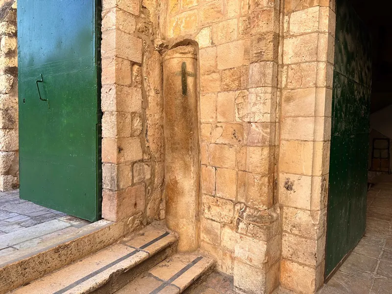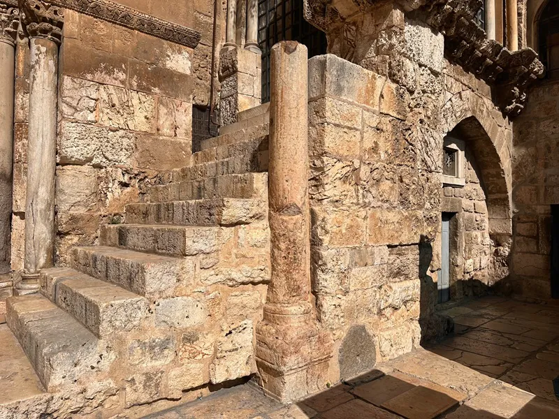 On the right side of the main entrance to the Church of the Holy Sepulchre is another Roman pillar attached to a wall in front of a flight of stairs. This pillar marks The Tenth Station, where Jesus was stripped of his clothes (John 19:23).