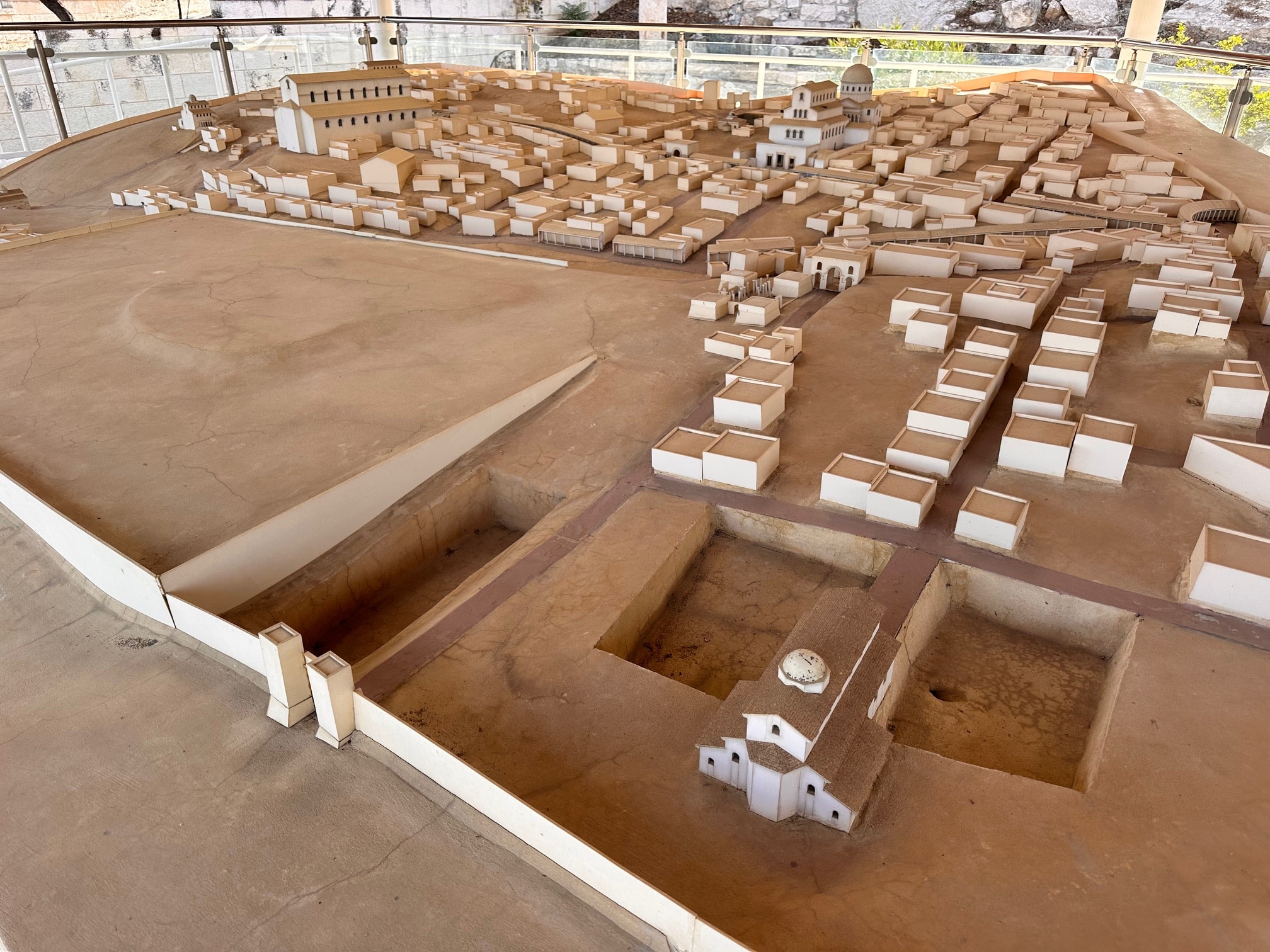 At the courtyard of the Church of Saint Peter in Gallicantu, visitors can also encounter a remarkable Byzantine model of the city, created in 2003. The model presents Jerusalem as it appeared during the Byzantine period, highlighting its walls, gates, streets, and grand churches. The model allows pilgrims to imagine the city when Christianity was flourishing, centuries after the time of Jesus and the Apostles. Its careful design helps visitors visualize the transformation of Jerusalem into a Christian center of pilgrimage, worship, and devotion from the 4th century CE and up to the Muslim conquest in 638 CE.