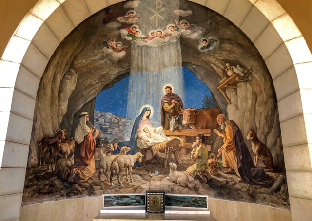 About 1200 feet north of the Greek-Orthodox church is an additional site where Byzantine-era remains were found among caves. It is called in Arabic ‘Siyar el-Ghanam’ (“The Den”). In 1954, the master architect, Antonio Barluzzi, designed a tent-shaped chapel to commemorate the event documented in the Gospels. Inside, beautiful frescoes depict the nativity of Jesus and his adoration by the Shepherds.