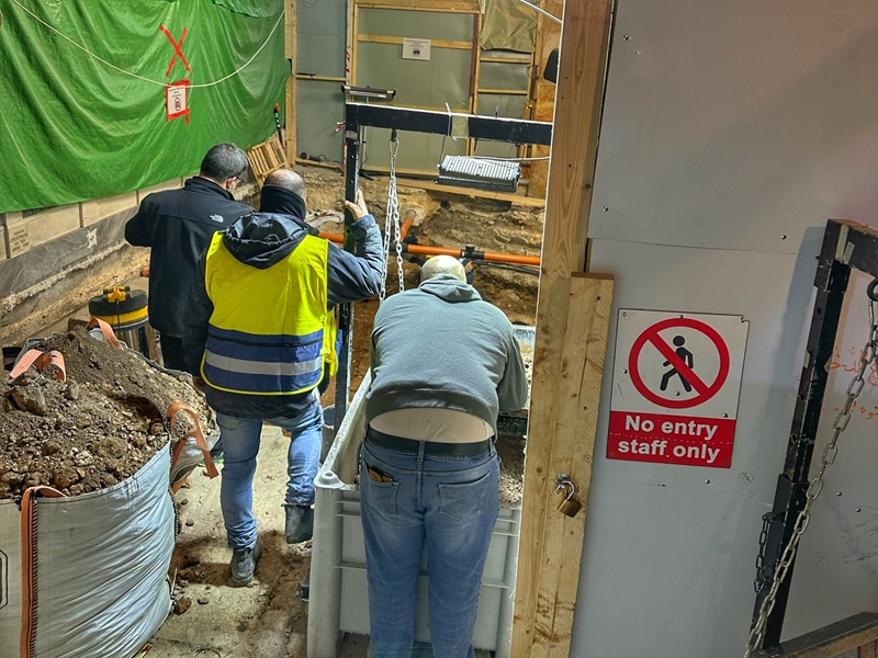 Excavations next to the Stone of Unction. Notice the large amount of brown soil in a white bulk bag.