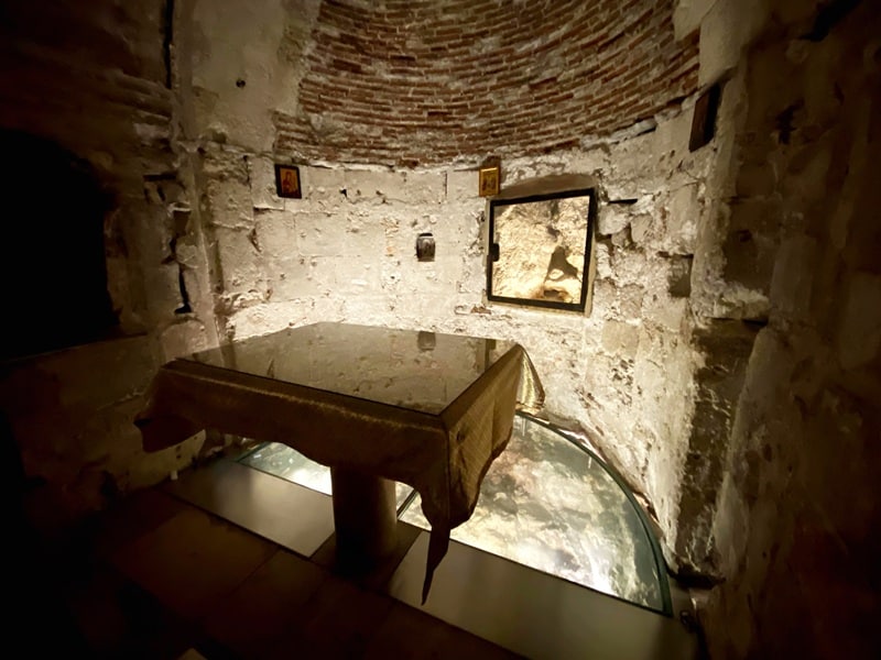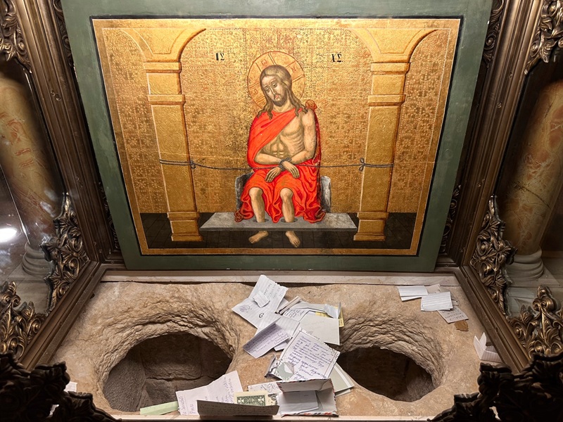 Moreover, right of the entrance is a slab of stone with two holes above a small cavity. By local tradition, Jesus was chained here with his legs. A wall mosaic in the back depicts the event.