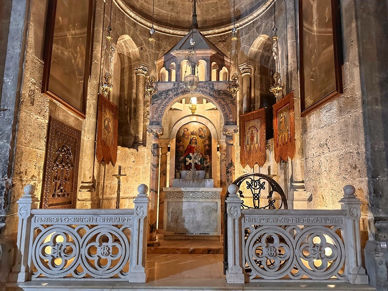 A candlestand beside the commemorative ciborium invites pilgrims to light votive candles. Its back wall also features a large mosaic depicting the crucifixion scene. An adjacent stairway leads to a section of the church’s second floor used as an Armenian monastery.