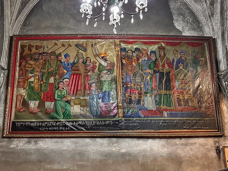 The Chapel is known for its mural along its southern wall, depicting in a unique Ethiopian style King Solomon’s Visit by Queen Sheba. By Ethiopian tradition, this visit led to the formation of the Ethiopian monarchy and the removal of the Ark of the Covenant from Jerusalem to Ethiopia.