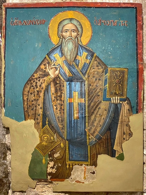 The icon follows the traditional Byzantine style, though its lower portion has deteriorated beyond restoration. The Greek inscription behind his head reads Ο ΑΓΙΟ ΔΙΟΝΥCς / Ο ΑΡΕΟΠΑΓΙΤΗΣ (“Saint Dionysus / the Areopagite”). His attire includes an “Epigonatio,” an honorary vestment depicting Jesus as a winged angel. Above this image are the Greek initials ΙΣ ΧΣ (“Jesus Christ”), accompanied by the inscription Ο ΤΗΣ ΜΕΓΑΛΗΣ ΒΟΥΛΗΣ ΑΝΓΓΕΛΟΣ (“The Angel of the Great Counsel”) – a reference to Isaiah 9:5 that Christians interpret as referring to Jesus.