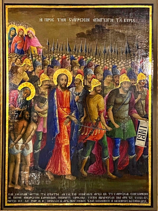 The icon depicts Jesus in red and blue robes, His hands bound, being led away by soldiers. While these guards wear Roman-style military dress, their long mustaches reflect not the first century but rather Ottoman fashion of the 19th century. One soldier carries a placard bearing the Greek letters INBI. These are initials for Ἰησοῦς ὁ Ναζωραῖος ὁ βασιλεὺς τῶν Ἰουδαίων (“Jesus of Nazareth King of the Jews”), as referenced in John 19:20. Created in Orthodox Post-Byzantine style, the icon bears a Greek inscription at its top: Η ΠΡΟΣ ΤΗΝ ΣΤΑΥΡΩΣΙΝ ΑΠΑΓΩΓΗ ΤΟΥ ΚΥΡΊΟΥ (“The Abduction of the Lord to the Cross”).