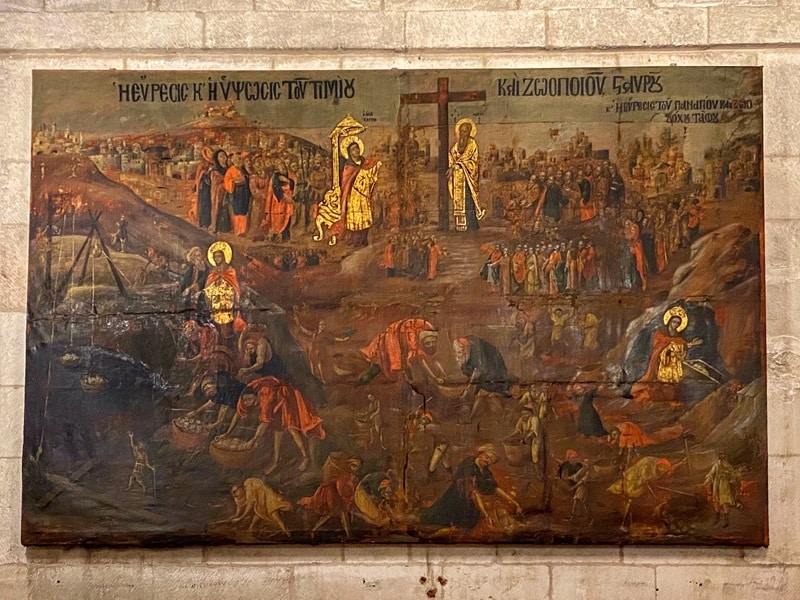 The easternmost Icon in the “Arches of the Virgin” arcade, is also the largest and is devoted to the recovery of the “True Cross” by Queen Helena. Designed in Byzantine style, the lower part shows a man excavating in search of the cross used for Jesus’ crucifixion. At the right side, Queen Helena is facing a rock-cut tomb with an empty sarcophagus. On the right she appears again, observing people excavating and a small person raises his hand in front of a big size cross.