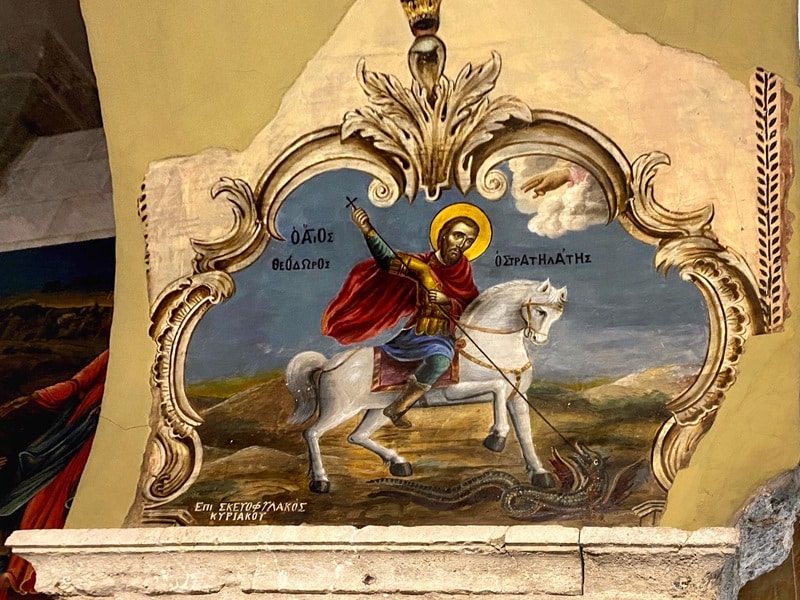 Facing the icon of Saint Theodorus “Tyron” is a fresco of Saint Theodorus “Stratelates” (meaning “the Commander”). Like his namesake, Saint Theodorus lived in Asia Minor during the early 4th century and was renowned for slaying a giant winged serpent. Despite his elevated military rank, he met a martyr’s fate during Emperor Licinius’s persecutions (311-324 AD) for refusing to renounce his Christian faith. According to Christian tradition, his execution was particularly brutal: he was dragged along the ground, beaten with iron rods, pierced with sharp spikes, burned, blinded, and finally crucified. Following Christianity’s rise, he became venerated as the patron saint of soldiers.
