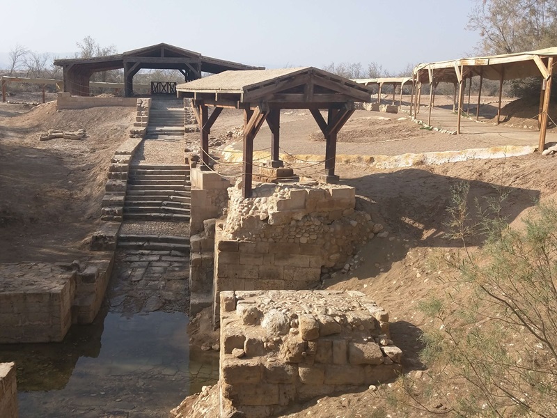 Opposite Al-Maghtas, on the western bank of the Jordan River, lies Qasr el Yahud. Its name reflects the memory of where the Israelites crossed the Jordan River (Joshua 3), finally entering the Promised Land. Located near Jericho, this site has also been a pilgrimage destination for centuries. Since the 1990s, Israeli authorities have developed the area for tourists and pilgrims, providing access to the river for baptisms and religious ceremonies. Recently plaques in different languages presenting the baptism of Jesus by John the Baptist have been installed at the site.