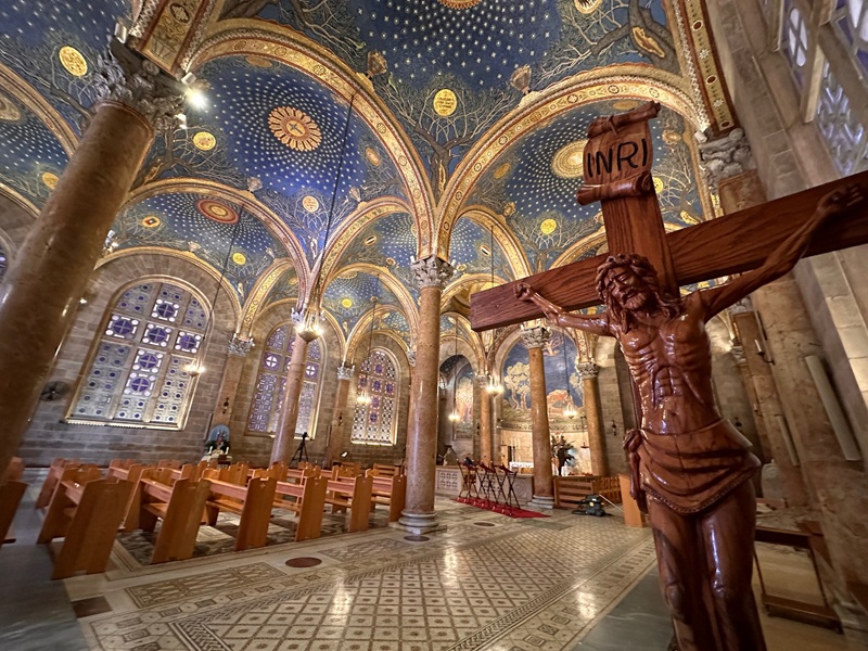 Also known as the Basilica of the Agony, this church is built over the rock where Jesus is believed to have prayed in agony the night before his crucifixion. Its beautiful mosaics and the preserved section of bedrock are particularly noteworthy. The church’s facade features a stunning golden mosaic, and inside, the dim lighting and stained-glass windows create an atmosphere of somber reflection.